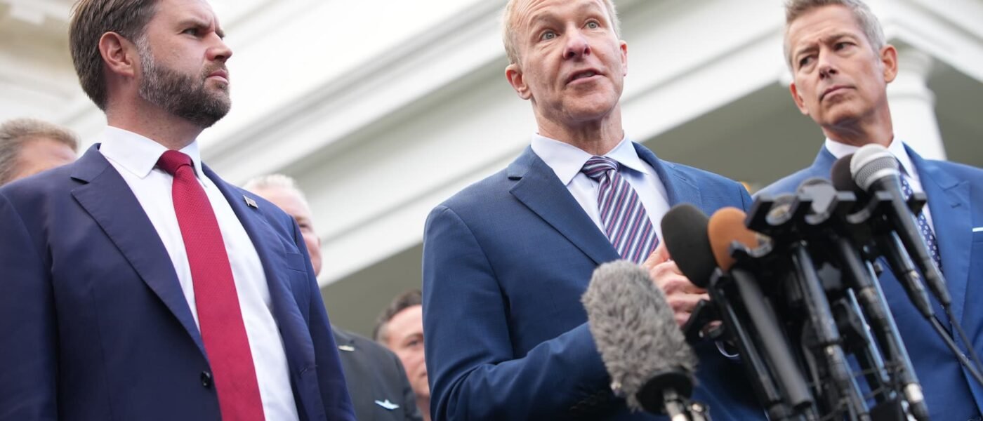 United Airlines CEO Scott Kirby, joined by U.S. Vice President JD Vance and Transportation Secretary Sean Duffy, speaks to reporters outside the White House on Oct. 30, 2025 in Washington, D.C.