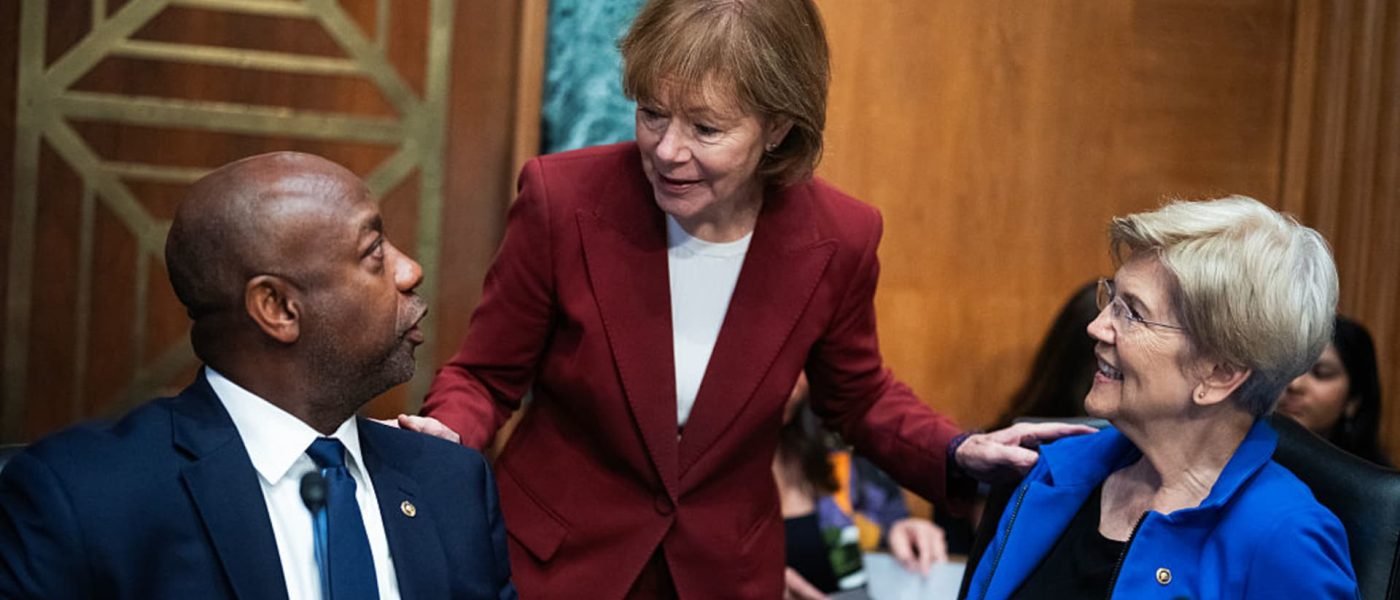 UNITED STATES – JULY 29: From left, Chairman Tim Scott, R-S.C., Sen. Tina Smith, D-Minn., and ranking member Sen. Elizabeth Warren, D-Mass., attend the Senate Banking, Housing and Urban Affairs Committee markup of the ROAD to Housing Act, in Dirksen building on Tuesday, July 29, 2025. (Tom Williams/CQ-Roll Call, Inc via Getty Images)