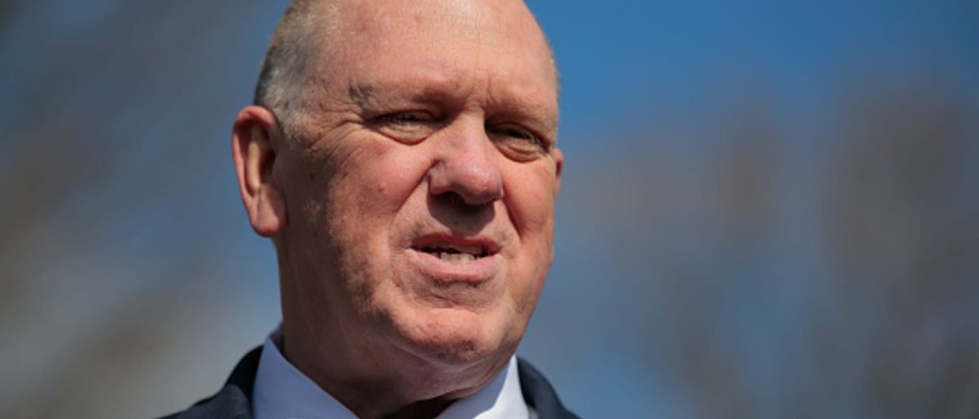 White House Border Czar Tom Homan talks with reporters on the driveway outside the West Wing on March 17, 2025 in Washington, DC.