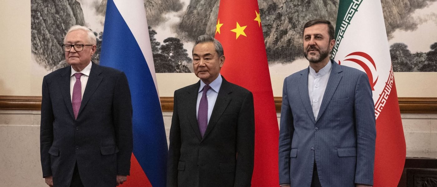 China’s Foreign Minister Wang Yi (C) welcomes Russia’s Deputy Foreign Minister Sergey Ryabkov (L) and Iran’s Deputy Foreign Minister Kazeem Gharibabadi before a meeting regarding the Iranian nuclear issue at the Diaoyutai State Guesthouse in Beijing on March 14, 2025.